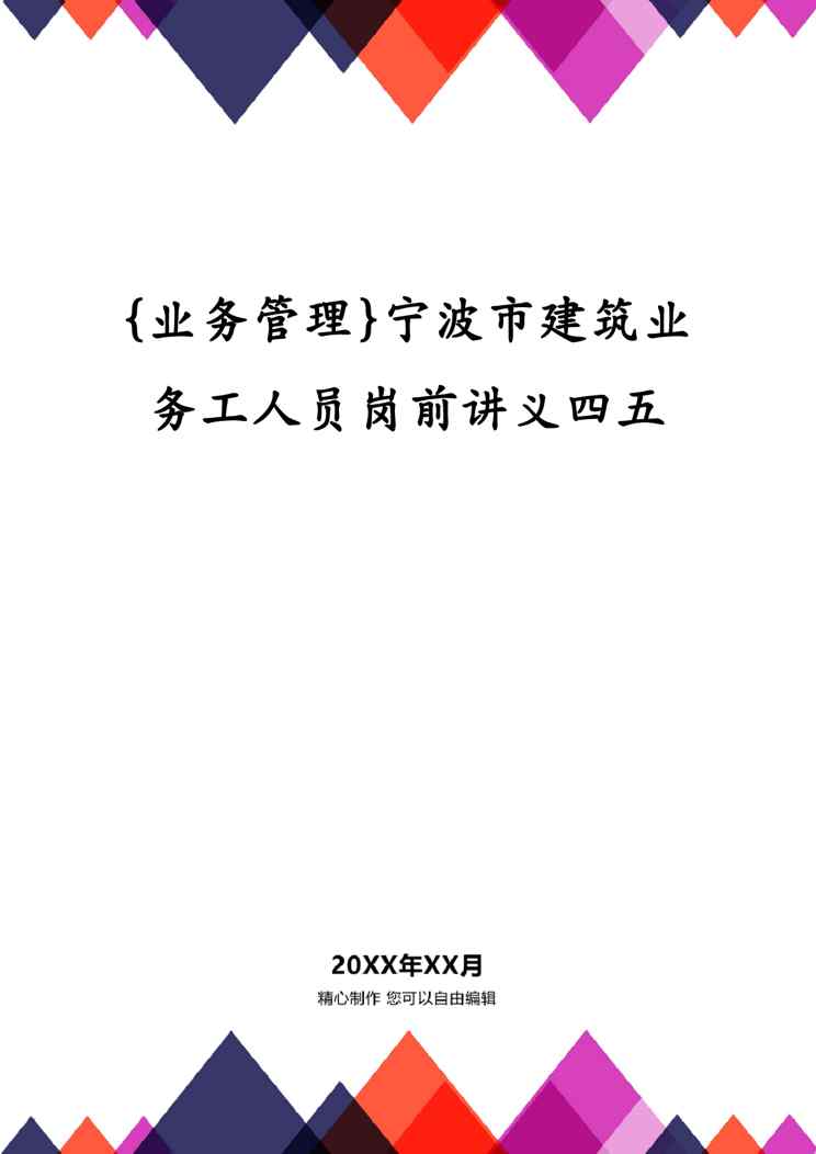 不久前,最新文档《{业务管理}宁波市建筑业务工人员岗前讲义四五1609151259》全文正式在本站发布,感兴趣的用户可以下载阅读。 声明:本站所有文章,如无特殊说明或标注,均为本站原创发布。任何个人或组织,在未征得本站同意时,禁止复制、盗用、采集、发布本站内容到任何网站、书籍等各类媒体平台。如若本站内容侵犯了原著者的合法权益,可联系我们进行处理。