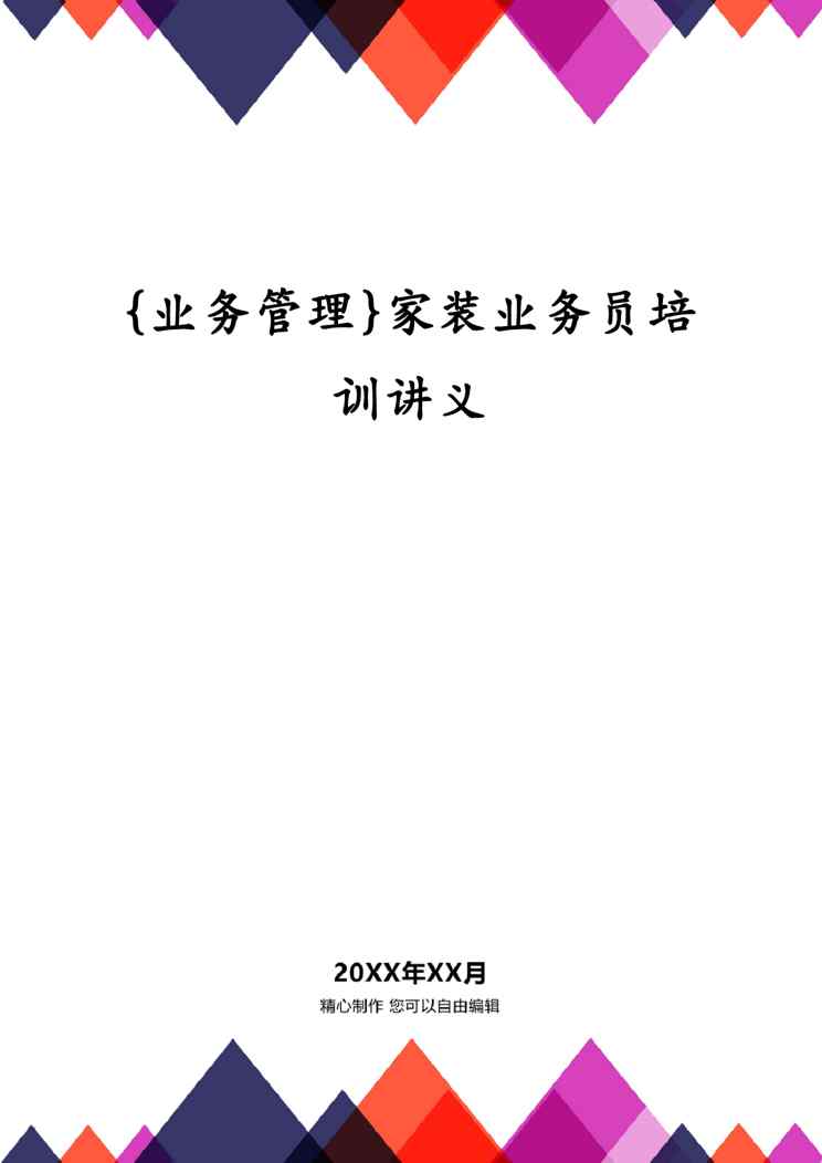本站正式发布了《{业务管理}家装业务员培训讲义1609151259》文档,文档详细内容可下载阅读。 声明:本站所有文章,如无特殊说明或标注,均为本站原创发布。任何个人或组织,在未征得本站同意时,禁止复制、盗用、采集、发布本站内容到任何网站、书籍等各类媒体平台。如若本站内容侵犯了原著者的合法权益,可联系我们进行处理。