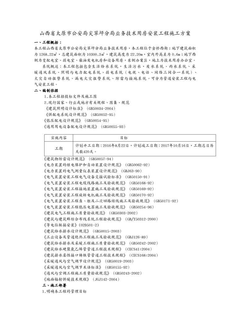 本站资深用户发布了最新的《{业务管理}尖草坪分局业务技术用房安装工程施工方案讲义1609151259》文档,以下内容为预览,详细内容可下载阅读。 声明:本站所有文章,如无特殊说明或标注,均为本站原创发布。任何个人或组织,在未征得本站同意时,禁止复制、盗用、采集、发布本站内容到任何网站、书籍等各类媒体平台。如若本站内容侵犯了原著者的合法权益,可联系我们进行处理。