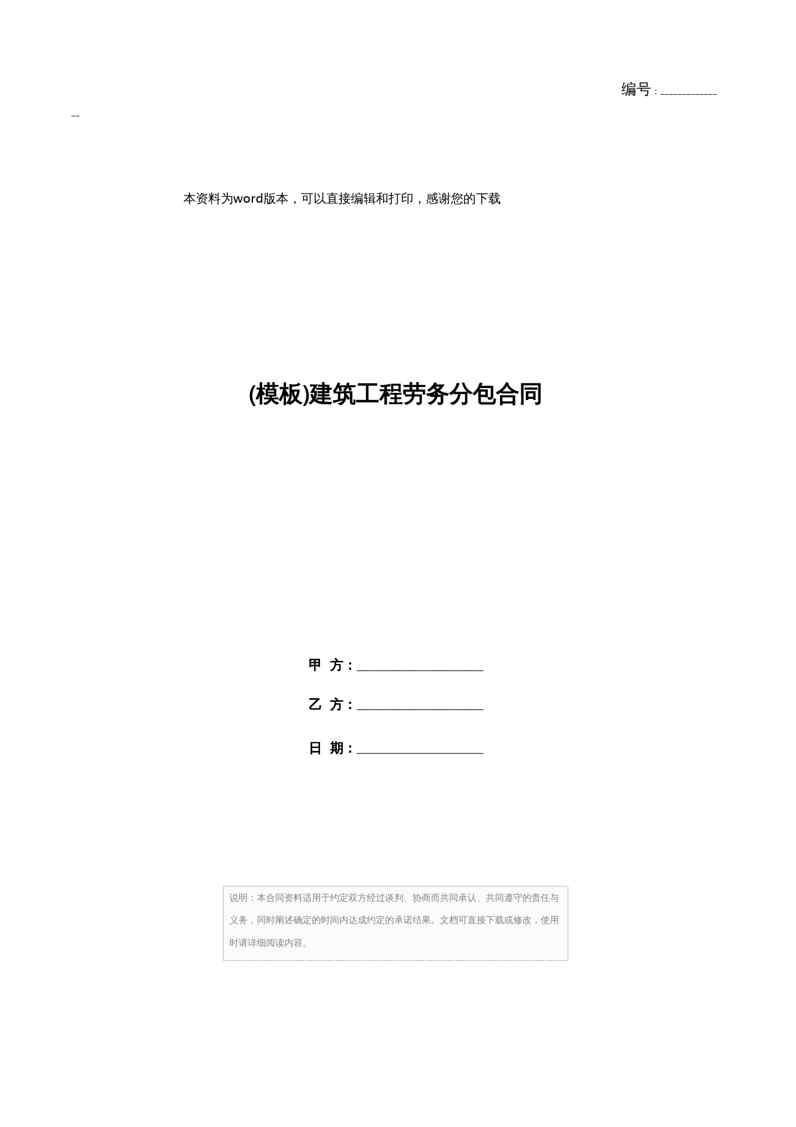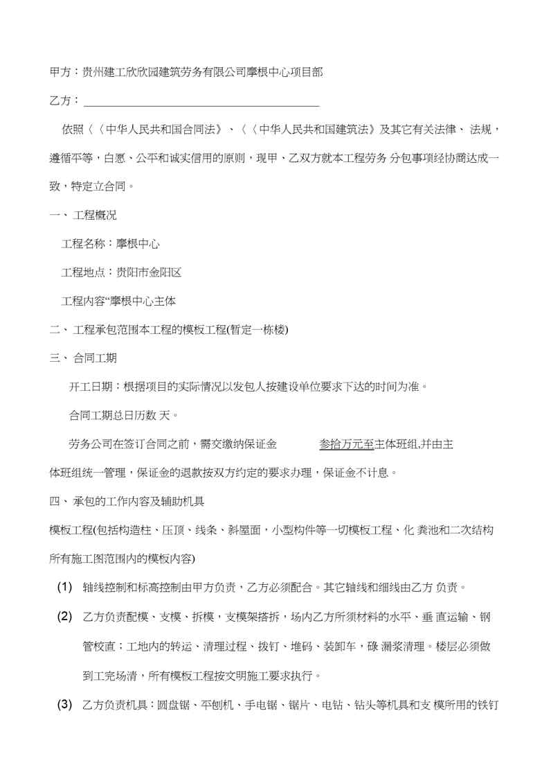 本站资深用户发布了最新的《(模板)建筑工程劳务分包合同》文档,以下内容为预览,详细内容可下载阅读。 声明:本站所有文章,如无特殊说明或标注,均为本站原创发布。任何个人或组织,在未征得本站同意时,禁止复制、盗用、采集、发布本站内容到任何网站、书籍等各类媒体平台。如若本站内容侵犯了原著者的合法权益,可联系我们进行处理。