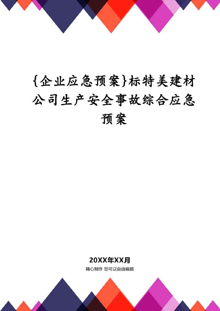 不久前,最新文档《{企业应急预案}标特美建材公司生产安全事故综合应急预案》全文正式在本站发布,感兴趣的用户可以下载阅读。 声明:本站所有文章,如无特殊说明或标注,均为本站原创发布。任何个人或组织,在未征得本站同意时,禁止复制、盗用、采集、发布本站内容到任何网站、书籍等各类媒体平台。如若本站内容侵犯了原著者的合法权益,可联系我们进行处理。