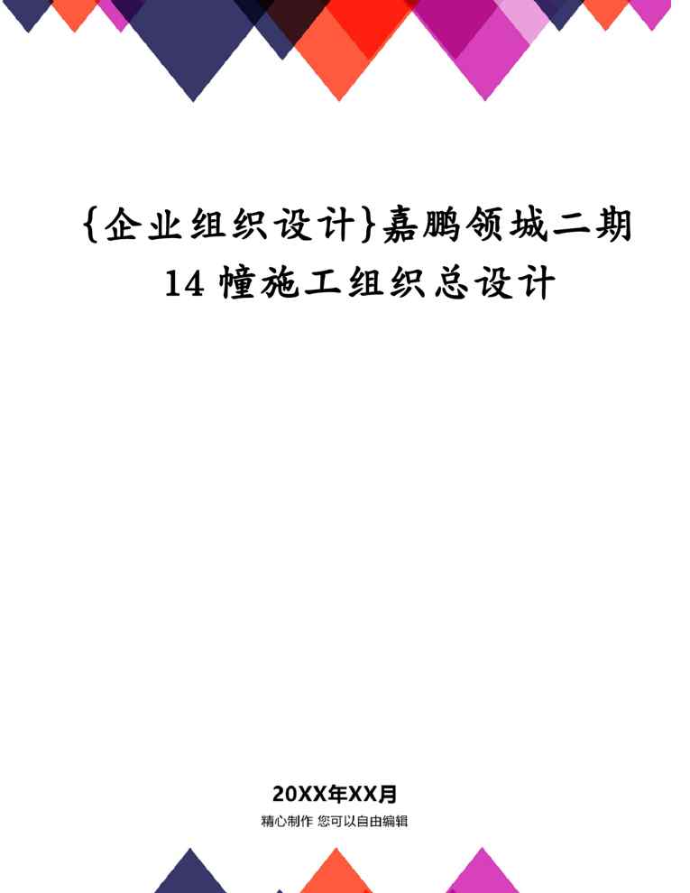 本站正式发布了《{企业组织设计}嘉鹏领城二期14幢施工组织总设计》文档,文档详细内容可下载阅读。 声明:本站所有文章,如无特殊说明或标注,均为本站原创发布。任何个人或组织,在未征得本站同意时,禁止复制、盗用、采集、发布本站内容到任何网站、书籍等各类媒体平台。如若本站内容侵犯了原著者的合法权益,可联系我们进行处理。