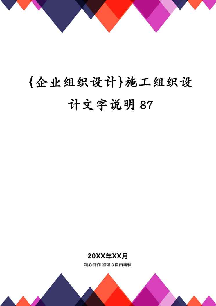 本站资深用户发布了最新的《{企业组织设计}施工组织设计文字说明87》文档,以下内容为预览,详细内容可下载阅读。 声明:本站所有文章,如无特殊说明或标注,均为本站原创发布。任何个人或组织,在未征得本站同意时,禁止复制、盗用、采集、发布本站内容到任何网站、书籍等各类媒体平台。如若本站内容侵犯了原著者的合法权益,可联系我们进行处理。