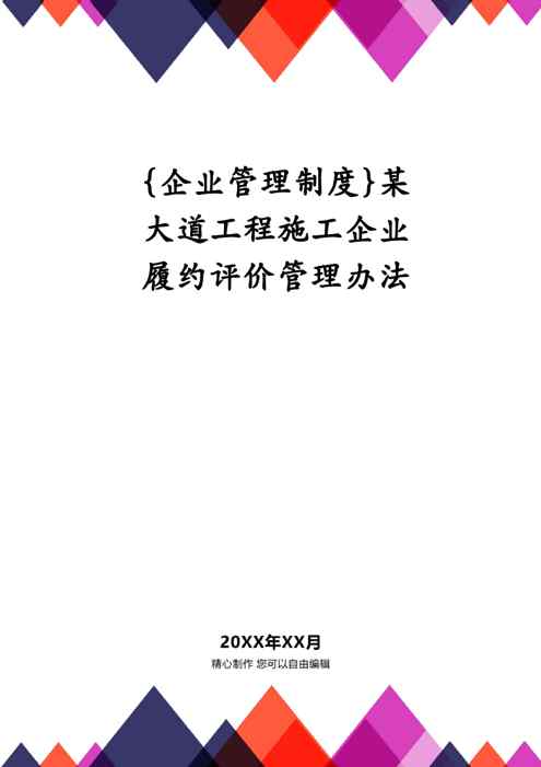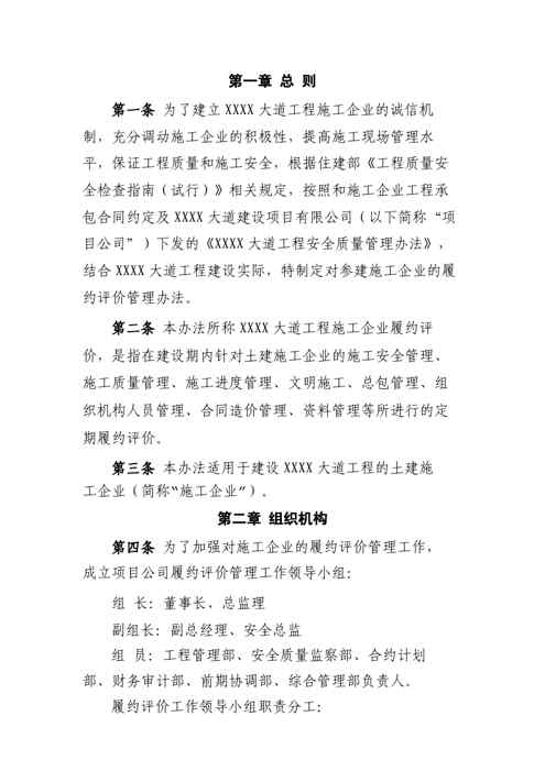 本站正式发布了《{企业管理制度}某大道工程施工企业履约评价管理办法》文档,文档详细内容可下载阅读。 声明:本站所有文章,如无特殊说明或标注,均为本站原创发布。任何个人或组织,在未征得本站同意时,禁止复制、盗用、采集、发布本站内容到任何网站、书籍等各类媒体平台。如若本站内容侵犯了原著者的合法权益,可联系我们进行处理。