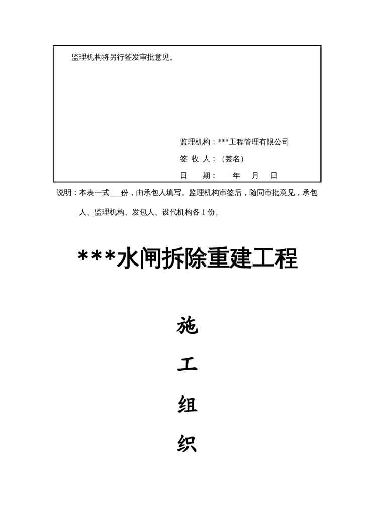 本站资深用户发布了最新的《{企业组织设计}水工水闸施工组织设计监理质监审核过20》文档,以下内容为预览,详细内容可下载阅读。 声明:本站所有文章,如无特殊说明或标注,均为本站原创发布。任何个人或组织,在未征得本站同意时,禁止复制、盗用、采集、发布本站内容到任何网站、书籍等各类媒体平台。如若本站内容侵犯了原著者的合法权益,可联系我们进行处理。