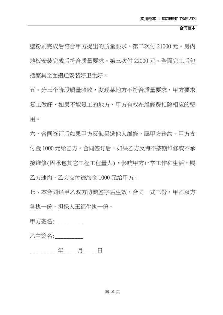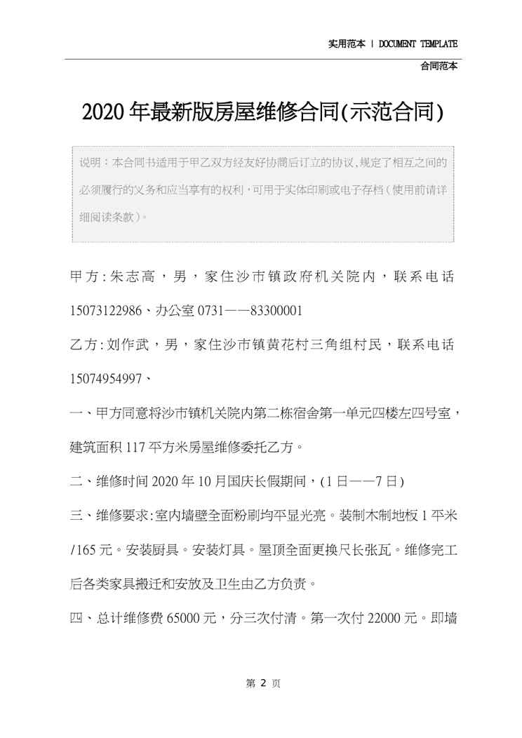 本站正式发布了《2020年最新版房屋维修合同(示范合同)》文档,文档详细内容可下载阅读。 声明:本站所有文章,如无特殊说明或标注,均为本站原创发布。任何个人或组织,在未征得本站同意时,禁止复制、盗用、采集、发布本站内容到任何网站、书籍等各类媒体平台。如若本站内容侵犯了原著者的合法权益,可联系我们进行处理。