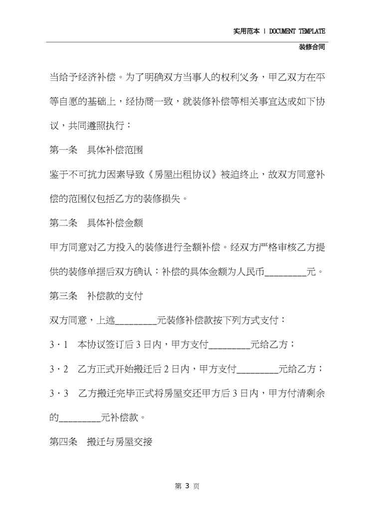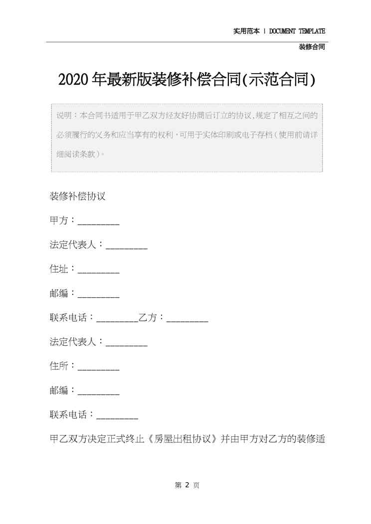 不久前,最新文档《2020年最新版装修补偿合同(示范合同)》全文正式在本站发布,感兴趣的用户可以下载阅读。 声明:本站所有文章,如无特殊说明或标注,均为本站原创发布。任何个人或组织,在未征得本站同意时,禁止复制、盗用、采集、发布本站内容到任何网站、书籍等各类媒体平台。如若本站内容侵犯了原著者的合法权益,可联系我们进行处理。
