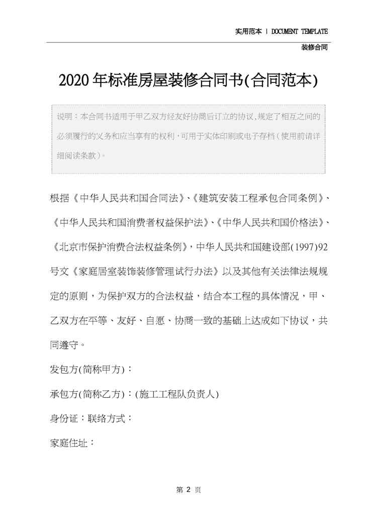 本站正式发布了《2020年标准房屋装修合同书(合同范本)》文档,文档详细内容可下载阅读。 声明:本站所有文章,如无特殊说明或标注,均为本站原创发布。任何个人或组织,在未征得本站同意时,禁止复制、盗用、采集、发布本站内容到任何网站、书籍等各类媒体平台。如若本站内容侵犯了原著者的合法权益,可联系我们进行处理。