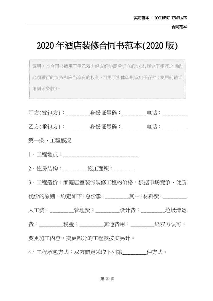 本站资深用户发布了最新的《2020年酒店装修合同书范本(2020版)》文档,以下内容为预览,详细内容可下载阅读。 声明:本站所有文章,如无特殊说明或标注,均为本站原创发布。任何个人或组织,在未征得本站同意时,禁止复制、盗用、采集、发布本站内容到任何网站、书籍等各类媒体平台。如若本站内容侵犯了原著者的合法权益,可联系我们进行处理。