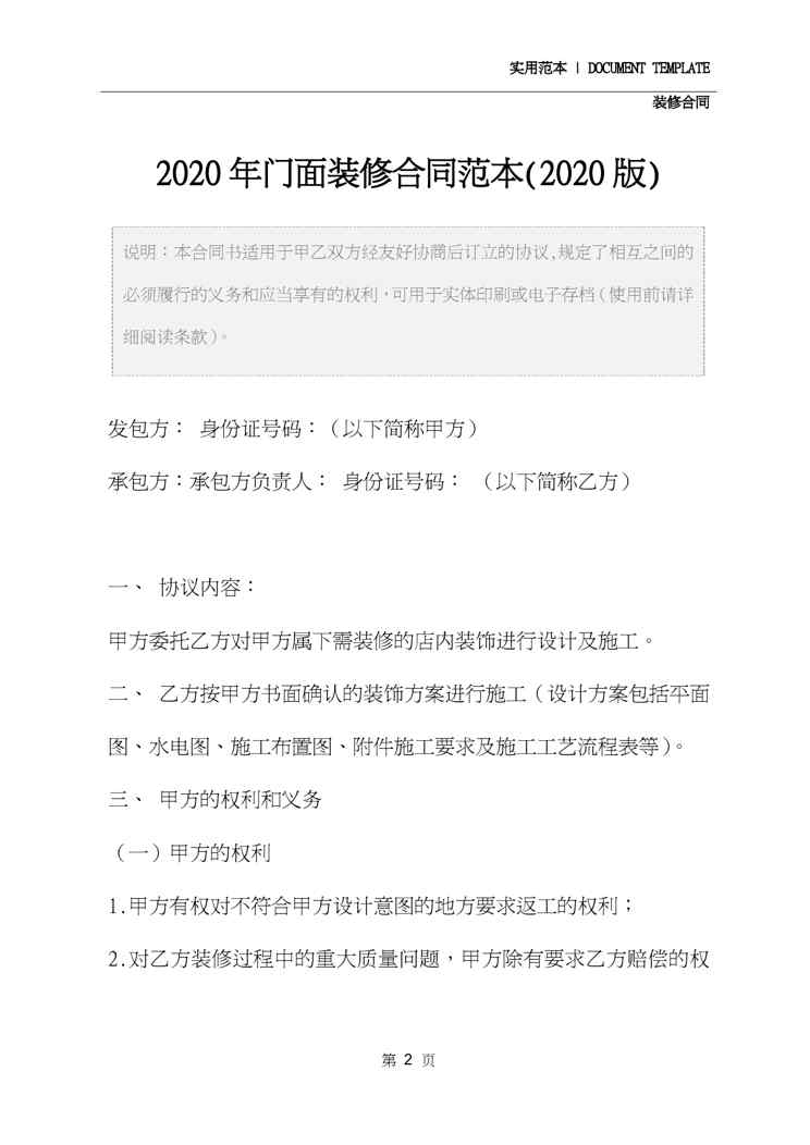 本站资深用户发布了最新的《2020年门面装修合同范本(2020版)》文档,以下内容为预览,详细内容可下载阅读。 声明:本站所有文章,如无特殊说明或标注,均为本站原创发布。任何个人或组织,在未征得本站同意时,禁止复制、盗用、采集、发布本站内容到任何网站、书籍等各类媒体平台。如若本站内容侵犯了原著者的合法权益,可联系我们进行处理。