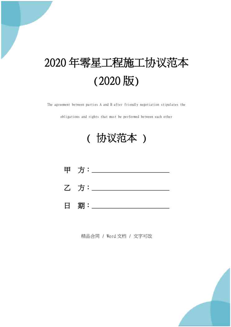 不久前,最新文档《2020年零星工程施工协议范本(2020版)》全文正式在本站发布,感兴趣的用户可以下载阅读。 声明:本站所有文章,如无特殊说明或标注,均为本站原创发布。任何个人或组织,在未征得本站同意时,禁止复制、盗用、采集、发布本站内容到任何网站、书籍等各类媒体平台。如若本站内容侵犯了原著者的合法权益,可联系我们进行处理。