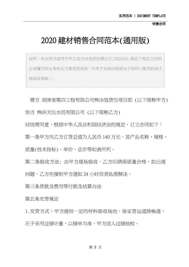 本站正式发布了《2020建材销售合同范本(通用版)》文档,文档详细内容可下载阅读。 声明:本站所有文章,如无特殊说明或标注,均为本站原创发布。任何个人或组织,在未征得本站同意时,禁止复制、盗用、采集、发布本站内容到任何网站、书籍等各类媒体平台。如若本站内容侵犯了原著者的合法权益,可联系我们进行处理。