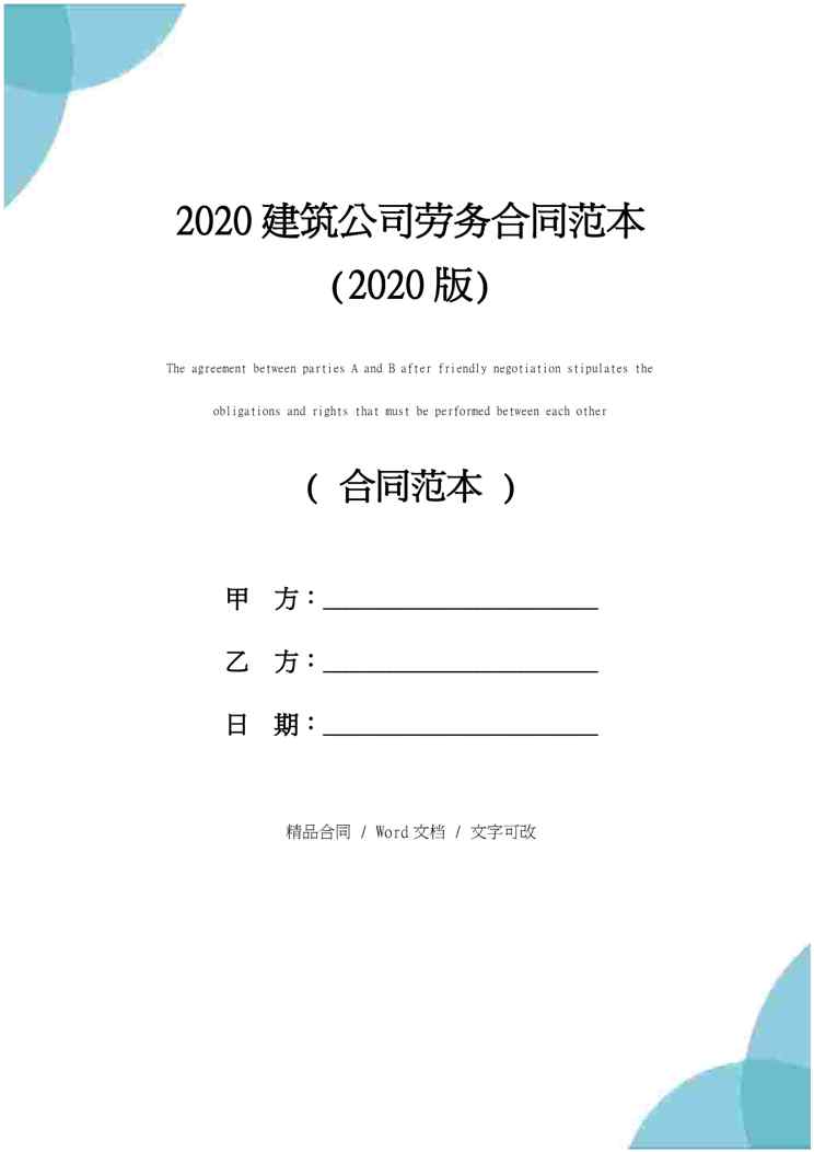 本站正式发布了《2020建筑公司劳务合同范本(2020版)》文档,文档详细内容可下载阅读。 声明:本站所有文章,如无特殊说明或标注,均为本站原创发布。任何个人或组织,在未征得本站同意时,禁止复制、盗用、采集、发布本站内容到任何网站、书籍等各类媒体平台。如若本站内容侵犯了原著者的合法权益,可联系我们进行处理。
