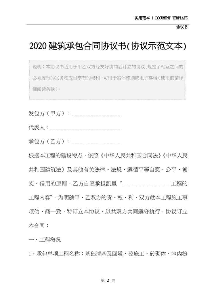 本站正式发布了《2020建筑承包合同协议书(协议示范文本)》文档,文档详细内容可下载阅读。 声明:本站所有文章,如无特殊说明或标注,均为本站原创发布。任何个人或组织,在未征得本站同意时,禁止复制、盗用、采集、发布本站内容到任何网站、书籍等各类媒体平台。如若本站内容侵犯了原著者的合法权益,可联系我们进行处理。