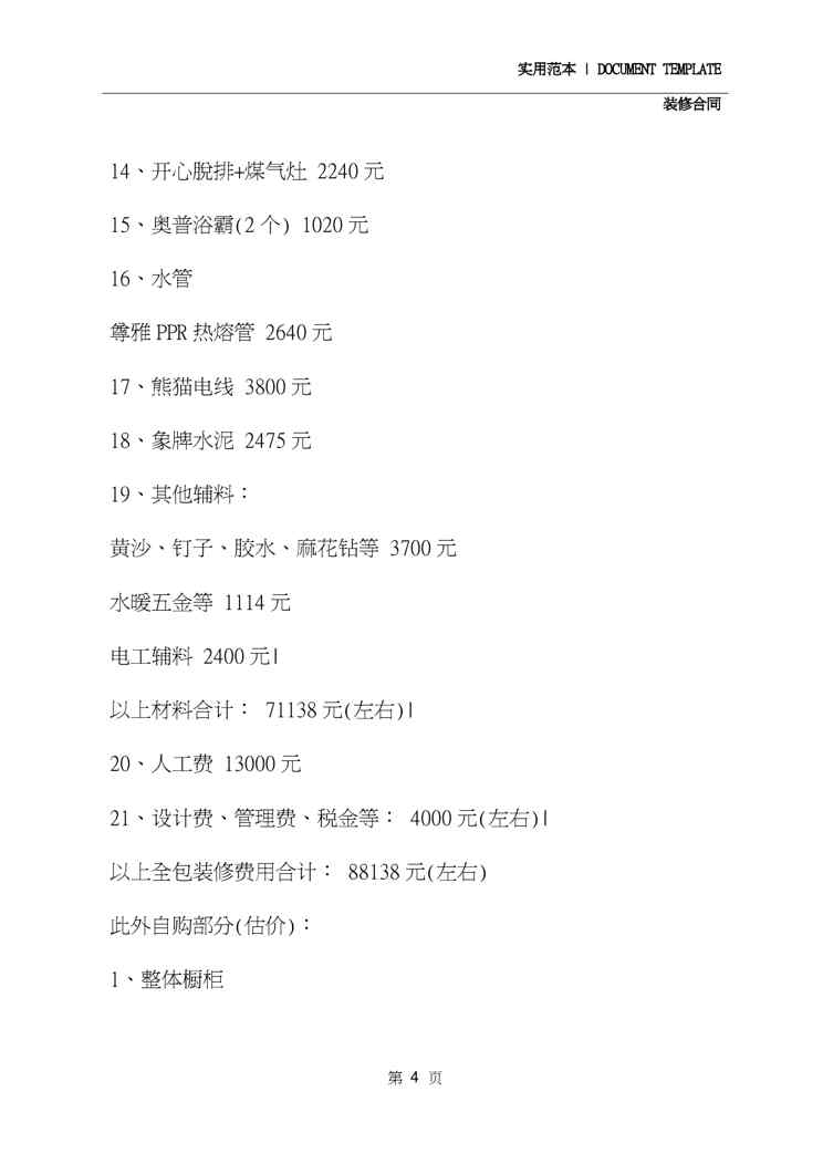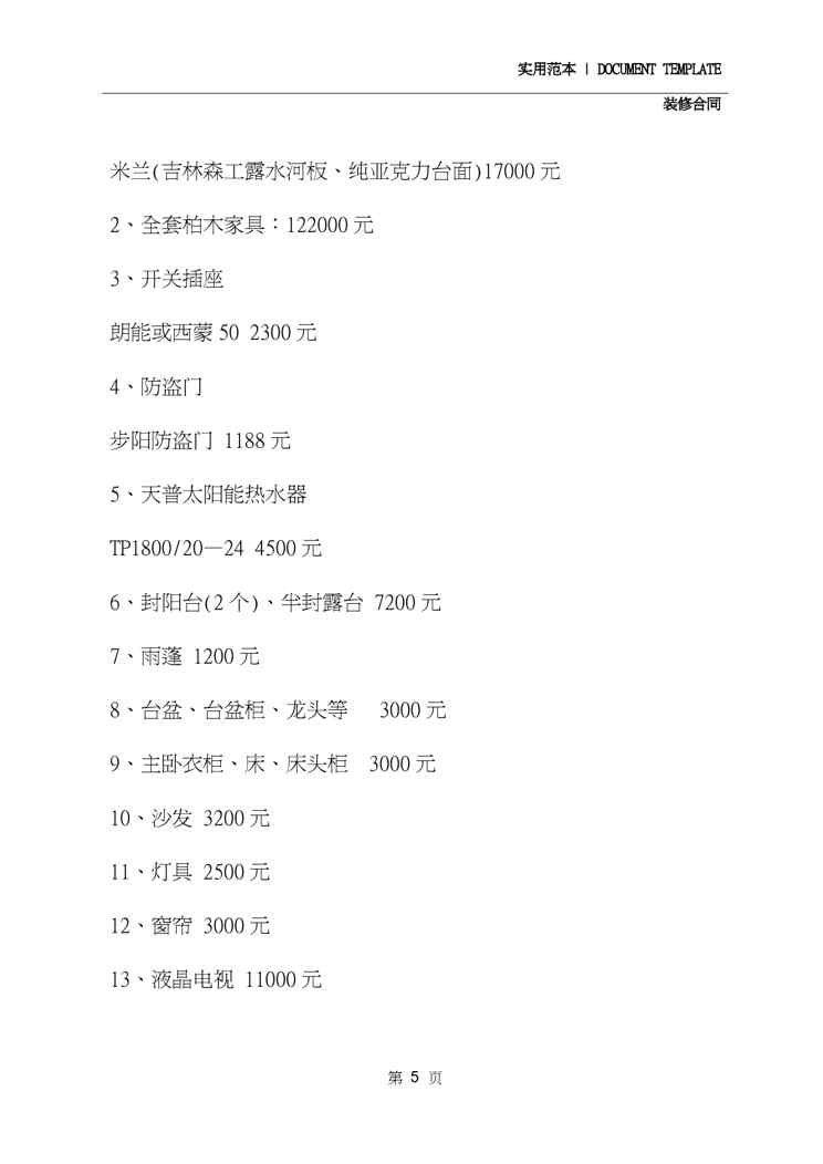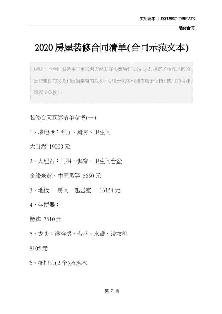 本站资深用户发布了最新的《2020房屋装修合同清单(合同示范文本)》文档,以下内容为预览,详细内容可下载阅读。 声明:本站所有文章,如无特殊说明或标注,均为本站原创发布。任何个人或组织,在未征得本站同意时,禁止复制、盗用、采集、发布本站内容到任何网站、书籍等各类媒体平台。如若本站内容侵犯了原著者的合法权益,可联系我们进行处理。