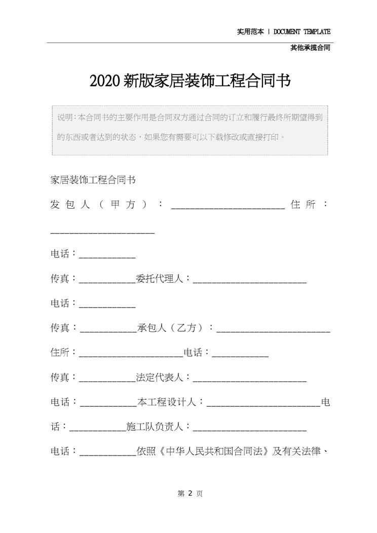 本站正式发布了《2020新版家居装饰工程合同书》文档,文档详细内容可下载阅读。 声明:本站所有文章,如无特殊说明或标注,均为本站原创发布。任何个人或组织,在未征得本站同意时,禁止复制、盗用、采集、发布本站内容到任何网站、书籍等各类媒体平台。如若本站内容侵犯了原著者的合法权益,可联系我们进行处理。