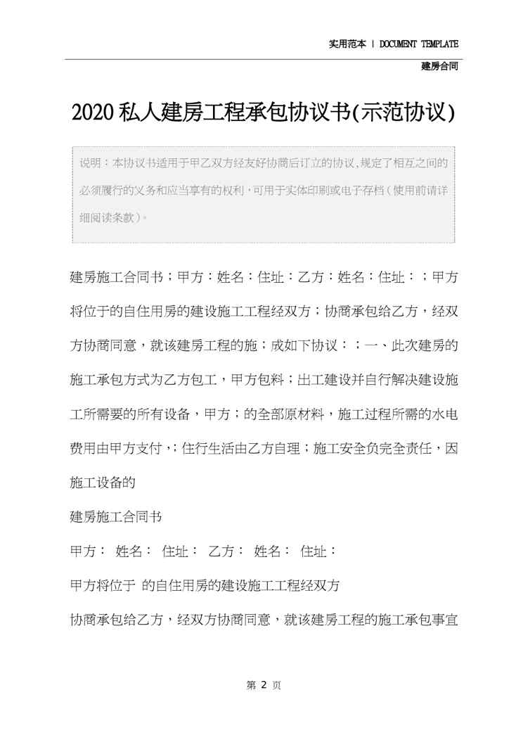 本站正式发布了《2020私人建房工程承包协议书(示范协议)》文档,文档详细内容可下载阅读。 声明:本站所有文章,如无特殊说明或标注,均为本站原创发布。任何个人或组织,在未征得本站同意时,禁止复制、盗用、采集、发布本站内容到任何网站、书籍等各类媒体平台。如若本站内容侵犯了原著者的合法权益,可联系我们进行处理。