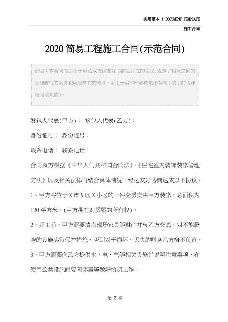本站资深用户发布了最新的《2020简易工程施工合同(示范合同)》文档,以下内容为预览,详细内容可下载阅读。 声明:本站所有文章,如无特殊说明或标注,均为本站原创发布。任何个人或组织,在未征得本站同意时,禁止复制、盗用、采集、发布本站内容到任何网站、书籍等各类媒体平台。如若本站内容侵犯了原著者的合法权益,可联系我们进行处理。