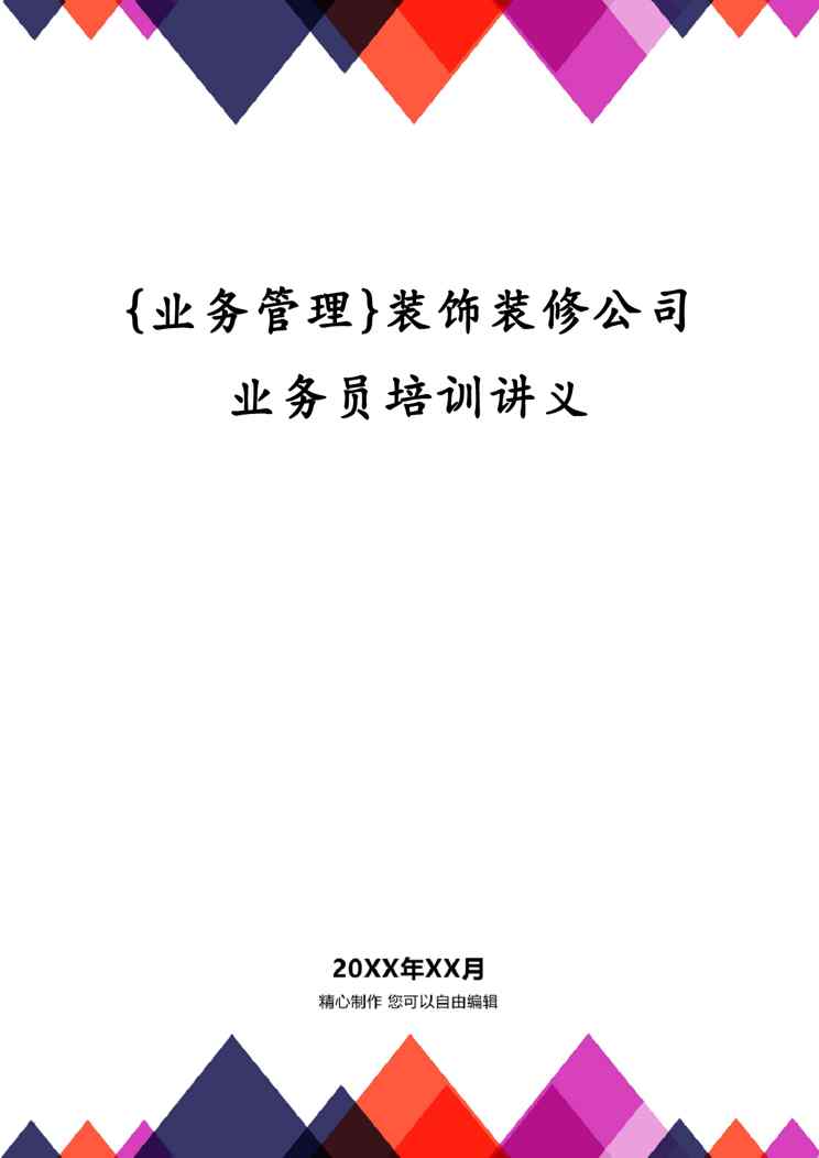 本站资深用户发布了最新的《{业务管理}装饰装修公司业务员培训讲义》文档,以下内容为预览,详细内容可下载阅读。 声明:本站所有文章,如无特殊说明或标注,均为本站原创发布。任何个人或组织,在未征得本站同意时,禁止复制、盗用、采集、发布本站内容到任何网站、书籍等各类媒体平台。如若本站内容侵犯了原著者的合法权益,可联系我们进行处理。