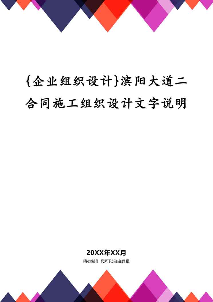 本站正式发布了《{企业组织设计}滨阳大道二合同施工组织设计文字说明》文档,文档详细内容可下载阅读。 声明:本站所有文章,如无特殊说明或标注,均为本站原创发布。任何个人或组织,在未征得本站同意时,禁止复制、盗用、采集、发布本站内容到任何网站、书籍等各类媒体平台。如若本站内容侵犯了原著者的合法权益,可联系我们进行处理。