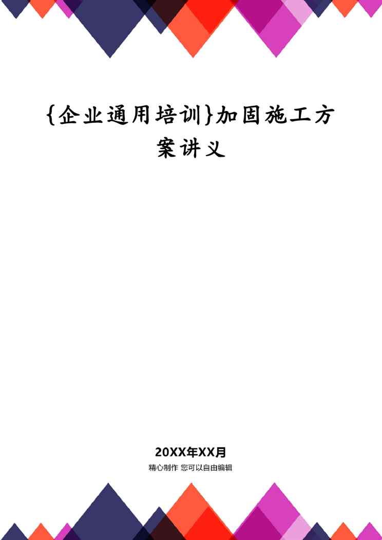 本站正式发布了《{企业通用培训}加固施工方案讲义》文档,文档详细内容可下载阅读。 声明:本站所有文章,如无特殊说明或标注,均为本站原创发布。任何个人或组织,在未征得本站同意时,禁止复制、盗用、采集、发布本站内容到任何网站、书籍等各类媒体平台。如若本站内容侵犯了原著者的合法权益,可联系我们进行处理。