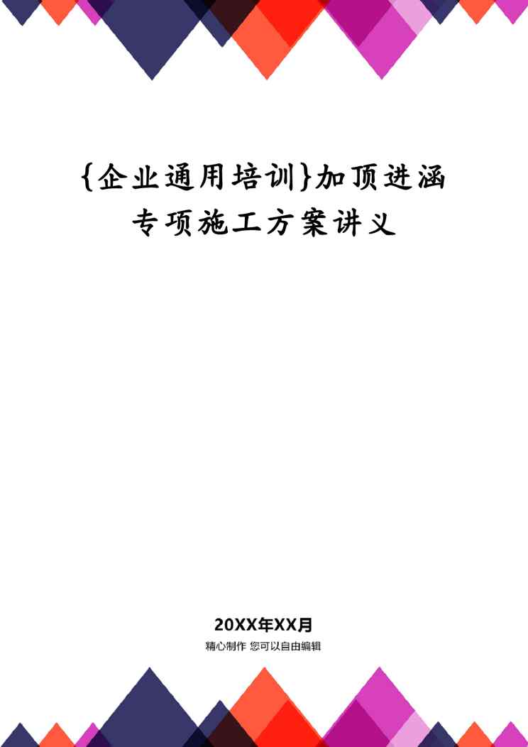 本站资深用户发布了最新的《{企业通用培训}加顶进涵专项施工方案讲义》文档,以下内容为预览,详细内容可下载阅读。 声明:本站所有文章,如无特殊说明或标注,均为本站原创发布。任何个人或组织,在未征得本站同意时,禁止复制、盗用、采集、发布本站内容到任何网站、书籍等各类媒体平台。如若本站内容侵犯了原著者的合法权益,可联系我们进行处理。