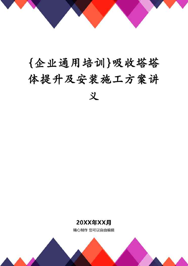 本站资深用户发布了最新的《{企业通用培训}吸收塔塔体提升及安装施工方案讲义》文档,以下内容为预览,详细内容可下载阅读。 声明:本站所有文章,如无特殊说明或标注,均为本站原创发布。任何个人或组织,在未征得本站同意时,禁止复制、盗用、采集、发布本站内容到任何网站、书籍等各类媒体平台。如若本站内容侵犯了原著者的合法权益,可联系我们进行处理。