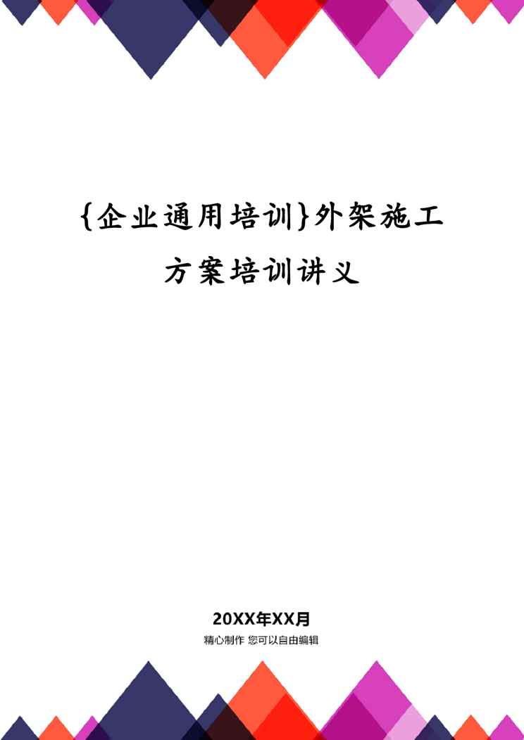 本站正式发布了《{企业通用培训}外架施工方案培训讲义》文档,文档详细内容可下载阅读。 声明:本站所有文章,如无特殊说明或标注,均为本站原创发布。任何个人或组织,在未征得本站同意时,禁止复制、盗用、采集、发布本站内容到任何网站、书籍等各类媒体平台。如若本站内容侵犯了原著者的合法权益,可联系我们进行处理。