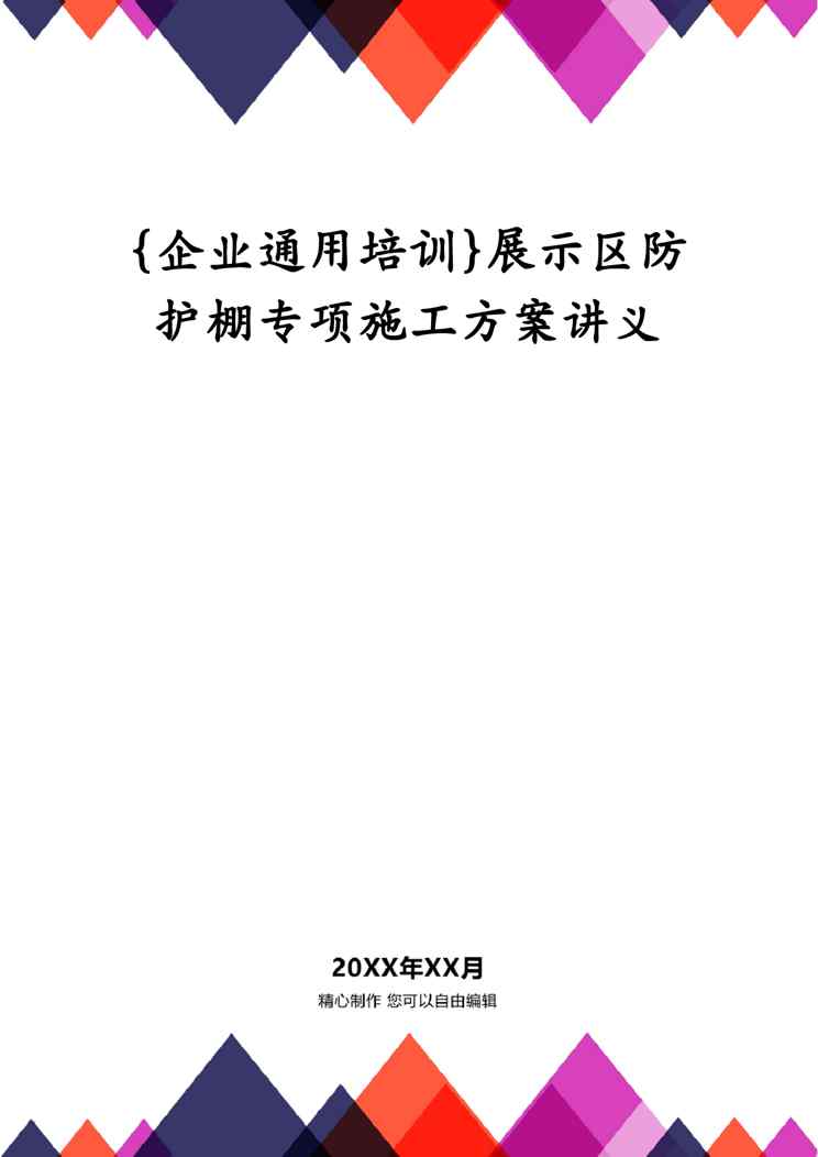 本站正式发布了《{企业通用培训}展示区防护棚专项施工方案讲义》文档,文档详细内容可下载阅读。 声明:本站所有文章,如无特殊说明或标注,均为本站原创发布。任何个人或组织,在未征得本站同意时,禁止复制、盗用、采集、发布本站内容到任何网站、书籍等各类媒体平台。如若本站内容侵犯了原著者的合法权益,可联系我们进行处理。