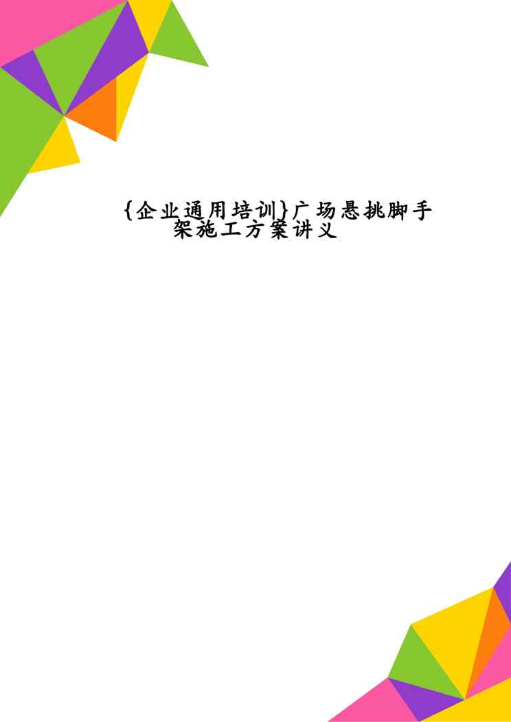 本站资深用户发布了最新的《{企业通用培训}广场悬挑脚手架施工方案讲义1609152369》文档,以下内容为预览,详细内容可下载阅读。 声明:本站所有文章,如无特殊说明或标注,均为本站原创发布。任何个人或组织,在未征得本站同意时,禁止复制、盗用、采集、发布本站内容到任何网站、书籍等各类媒体平台。如若本站内容侵犯了原著者的合法权益,可联系我们进行处理。