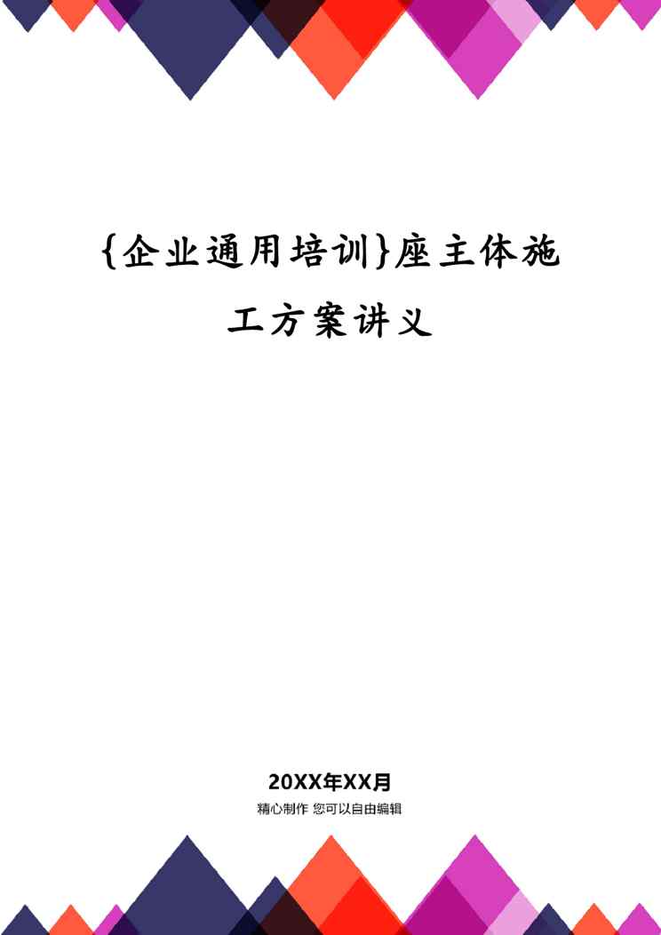 不久前,最新文档《{企业通用培训}座主体施工方案讲义》全文正式在本站发布,感兴趣的用户可以下载阅读。 声明:本站所有文章,如无特殊说明或标注,均为本站原创发布。任何个人或组织,在未征得本站同意时,禁止复制、盗用、采集、发布本站内容到任何网站、书籍等各类媒体平台。如若本站内容侵犯了原著者的合法权益,可联系我们进行处理。