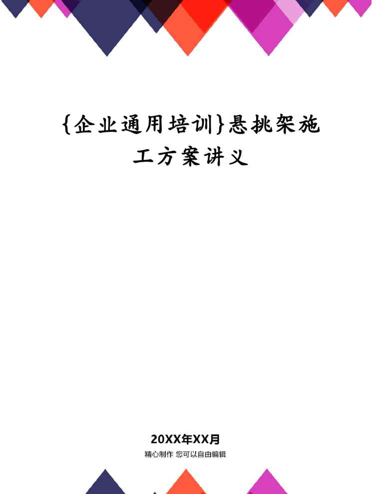 本站资深用户发布了最新的《{企业通用培训}悬挑架施工方案讲义》文档,以下内容为预览,详细内容可下载阅读。 声明:本站所有文章,如无特殊说明或标注,均为本站原创发布。任何个人或组织,在未征得本站同意时,禁止复制、盗用、采集、发布本站内容到任何网站、书籍等各类媒体平台。如若本站内容侵犯了原著者的合法权益,可联系我们进行处理。
