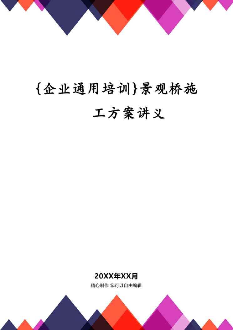 本站资深用户发布了最新的《{企业通用培训}景观桥施工方案讲义》文档,以下内容为预览,详细内容可下载阅读。 声明:本站所有文章,如无特殊说明或标注,均为本站原创发布。任何个人或组织,在未征得本站同意时,禁止复制、盗用、采集、发布本站内容到任何网站、书籍等各类媒体平台。如若本站内容侵犯了原著者的合法权益,可联系我们进行处理。