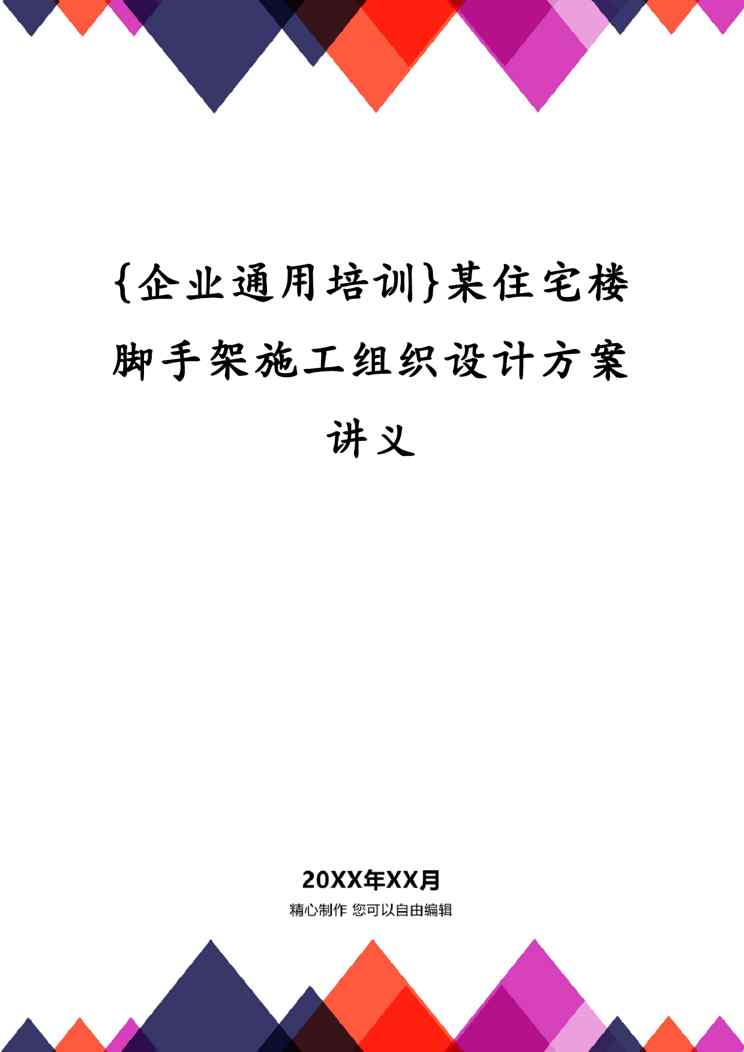 本站资深用户发布了最新的《{企业通用培训}某住宅楼脚手架施工组织设计方案讲义》文档,以下内容为预览,详细内容可下载阅读。 声明:本站所有文章,如无特殊说明或标注,均为本站原创发布。任何个人或组织,在未征得本站同意时,禁止复制、盗用、采集、发布本站内容到任何网站、书籍等各类媒体平台。如若本站内容侵犯了原著者的合法权益,可联系我们进行处理。