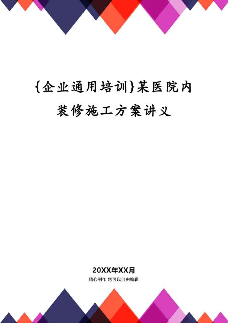 本站正式发布了《{企业通用培训}某医院内装修施工方案讲义》文档,文档详细内容可下载阅读。 声明:本站所有文章,如无特殊说明或标注,均为本站原创发布。任何个人或组织,在未征得本站同意时,禁止复制、盗用、采集、发布本站内容到任何网站、书籍等各类媒体平台。如若本站内容侵犯了原著者的合法权益,可联系我们进行处理。