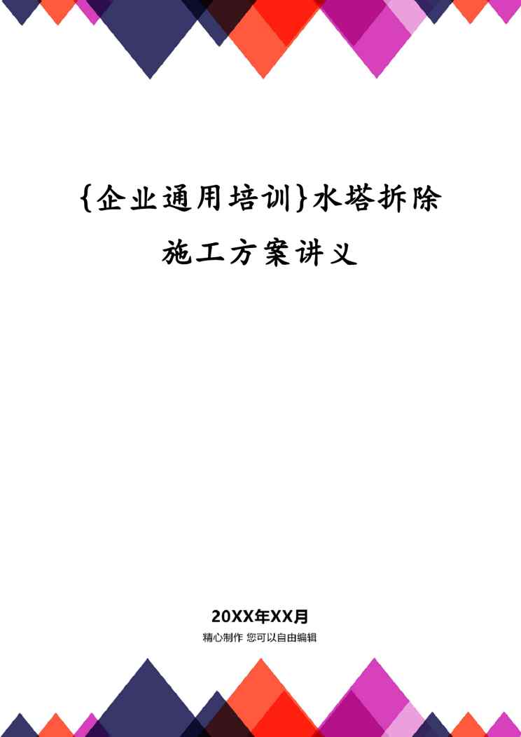 本站正式发布了《{企业通用培训}水塔拆除施工方案讲义》文档,文档详细内容可下载阅读。 声明:本站所有文章,如无特殊说明或标注,均为本站原创发布。任何个人或组织,在未征得本站同意时,禁止复制、盗用、采集、发布本站内容到任何网站、书籍等各类媒体平台。如若本站内容侵犯了原著者的合法权益,可联系我们进行处理。