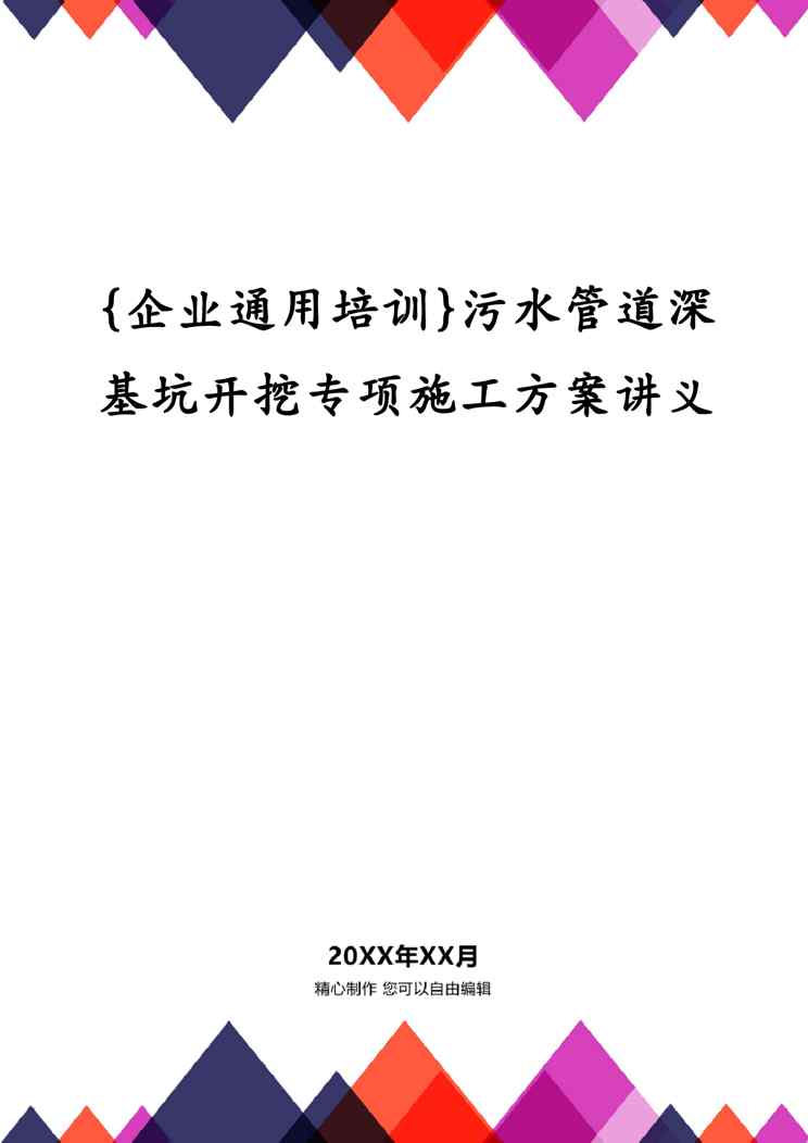 本站资深用户发布了最新的《{企业通用培训}污水管道深基坑开挖专项施工方案讲义》文档,以下内容为预览,详细内容可下载阅读。 声明:本站所有文章,如无特殊说明或标注,均为本站原创发布。任何个人或组织,在未征得本站同意时,禁止复制、盗用、采集、发布本站内容到任何网站、书籍等各类媒体平台。如若本站内容侵犯了原著者的合法权益,可联系我们进行处理。