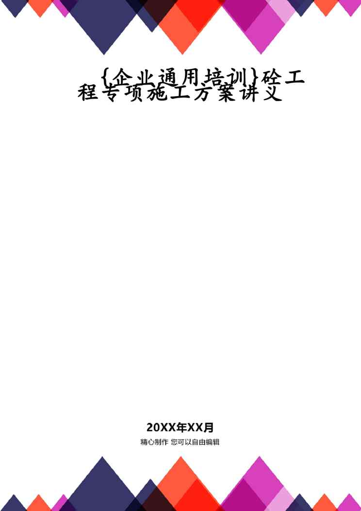 本站资深用户发布了最新的《{企业通用培训}砼工程专项施工方案讲义》文档,以下内容为预览,详细内容可下载阅读。 声明:本站所有文章,如无特殊说明或标注,均为本站原创发布。任何个人或组织,在未征得本站同意时,禁止复制、盗用、采集、发布本站内容到任何网站、书籍等各类媒体平台。如若本站内容侵犯了原著者的合法权益,可联系我们进行处理。