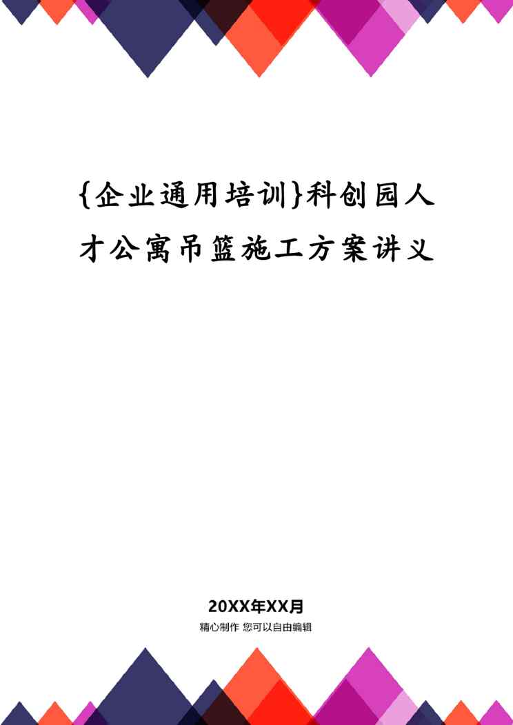 不久前,最新文档《{企业通用培训}科创园人才公寓吊篮施工方案讲义》全文正式在本站发布,感兴趣的用户可以下载阅读。 声明:本站所有文章,如无特殊说明或标注,均为本站原创发布。任何个人或组织,在未征得本站同意时,禁止复制、盗用、采集、发布本站内容到任何网站、书籍等各类媒体平台。如若本站内容侵犯了原著者的合法权益,可联系我们进行处理。