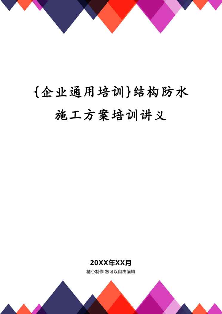 本站正式发布了《{企业通用培训}结构防水施工方案培训讲义》文档,文档详细内容可下载阅读。 声明:本站所有文章,如无特殊说明或标注,均为本站原创发布。任何个人或组织,在未征得本站同意时,禁止复制、盗用、采集、发布本站内容到任何网站、书籍等各类媒体平台。如若本站内容侵犯了原著者的合法权益,可联系我们进行处理。