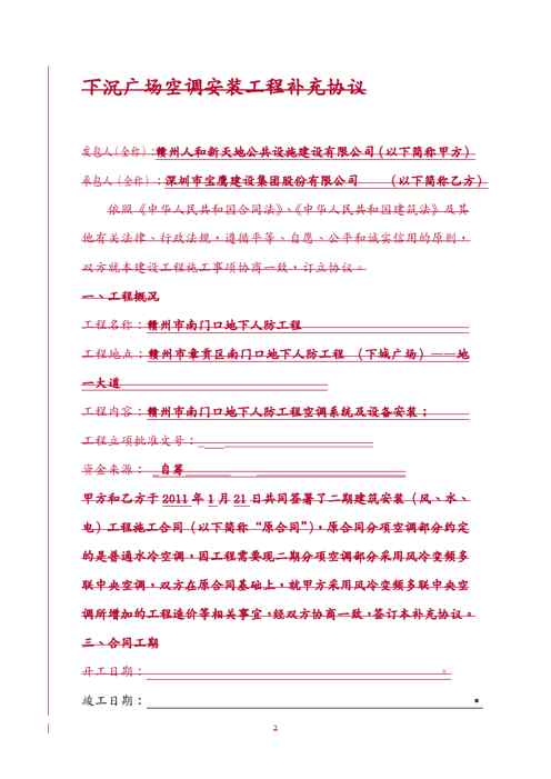 本站资深用户发布了最新的《{工程合同}赣州下沉广场空调安装工程补充协议合同协议表格模板实用》文档,以下内容为预览,详细内容可下载阅读。 声明:本站所有文章,如无特殊说明或标注,均为本站原创发布。任何个人或组织,在未征得本站同意时,禁止复制、盗用、采集、发布本站内容到任何网站、书籍等各类媒体平台。如若本站内容侵犯了原著者的合法权益,可联系我们进行处理。