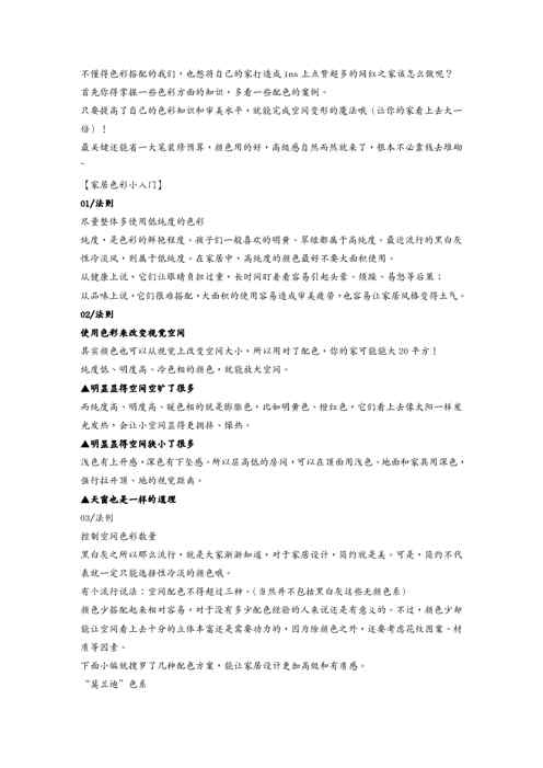 本站资深用户发布了最新的《{营销方案}新房装修软装搭配方案大全》文档,以下内容为预览,详细内容可下载阅读。 声明:本站所有文章,如无特殊说明或标注,均为本站原创发布。任何个人或组织,在未征得本站同意时,禁止复制、盗用、采集、发布本站内容到任何网站、书籍等各类媒体平台。如若本站内容侵犯了原著者的合法权益,可联系我们进行处理。