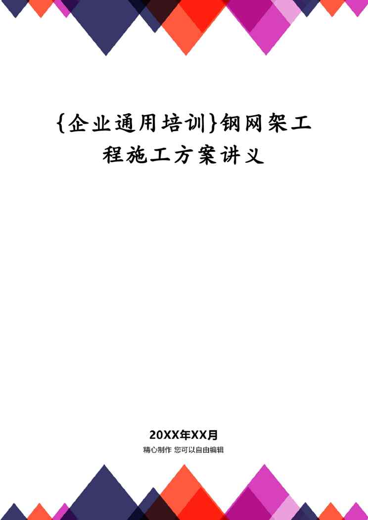 本站正式发布了《{企业通用培训}钢网架工程施工方案讲义》文档,文档详细内容可下载阅读。 声明:本站所有文章,如无特殊说明或标注,均为本站原创发布。任何个人或组织,在未征得本站同意时,禁止复制、盗用、采集、发布本站内容到任何网站、书籍等各类媒体平台。如若本站内容侵犯了原著者的合法权益,可联系我们进行处理。