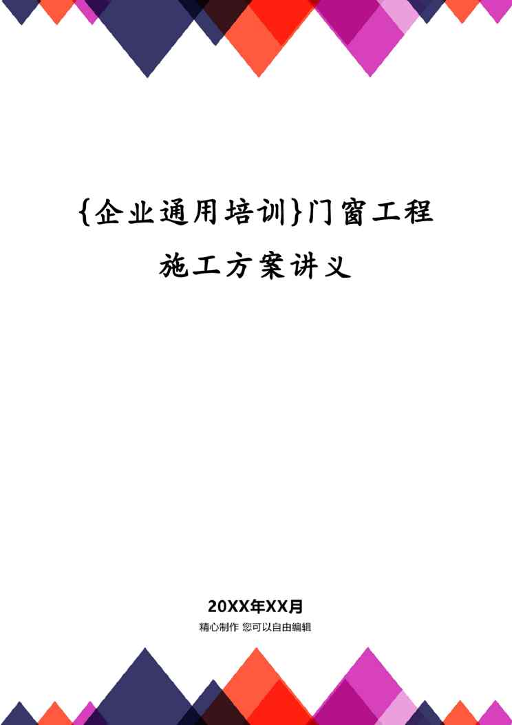 本站正式发布了《{企业通用培训}门窗工程施工方案讲义》文档,文档详细内容可下载阅读。 声明:本站所有文章,如无特殊说明或标注,均为本站原创发布。任何个人或组织,在未征得本站同意时,禁止复制、盗用、采集、发布本站内容到任何网站、书籍等各类媒体平台。如若本站内容侵犯了原著者的合法权益,可联系我们进行处理。