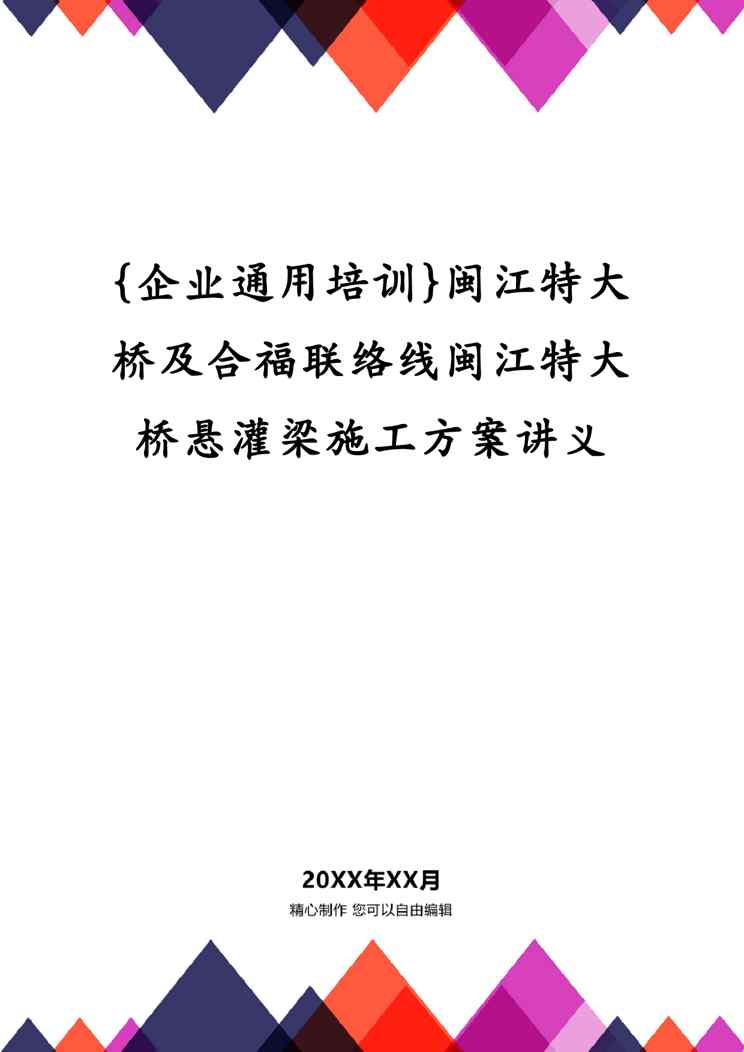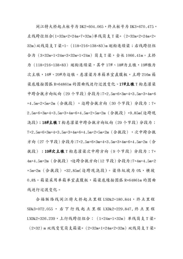 不久前,最新文档《{企业通用培训}闽江特大桥及合福联络线闽江特大桥悬灌梁施工方案讲义》全文正式在本站发布,感兴趣的用户可以下载阅读。 声明:本站所有文章,如无特殊说明或标注,均为本站原创发布。任何个人或组织,在未征得本站同意时,禁止复制、盗用、采集、发布本站内容到任何网站、书籍等各类媒体平台。如若本站内容侵犯了原著者的合法权益,可联系我们进行处理。