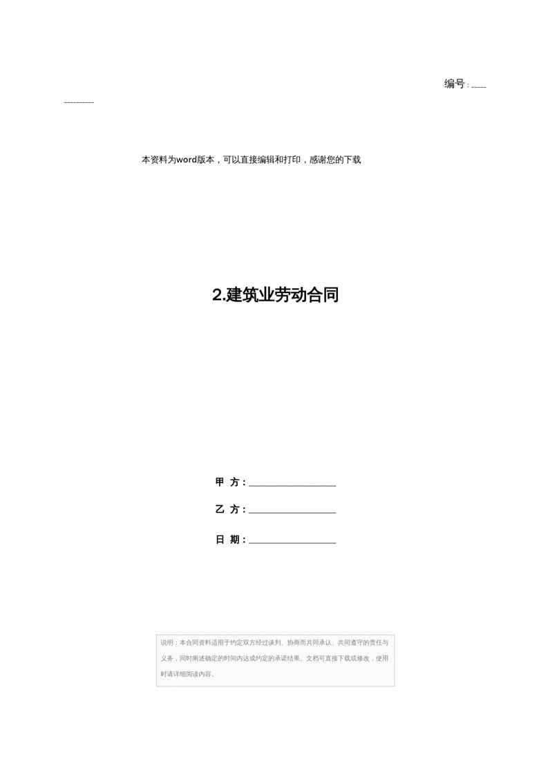 不久前,最新文档《2.建筑业劳动合同》全文正式在本站发布,感兴趣的用户可以下载阅读。 声明:本站所有文章,如无特殊说明或标注,均为本站原创发布。任何个人或组织,在未征得本站同意时,禁止复制、盗用、采集、发布本站内容到任何网站、书籍等各类媒体平台。如若本站内容侵犯了原著者的合法权益,可联系我们进行处理。