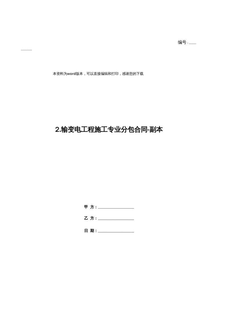 本站资深用户发布了最新的《2.输变电工程施工专业分包合同-副本》文档,以下内容为预览,详细内容可下载阅读。 声明:本站所有文章,如无特殊说明或标注,均为本站原创发布。任何个人或组织,在未征得本站同意时,禁止复制、盗用、采集、发布本站内容到任何网站、书籍等各类媒体平台。如若本站内容侵犯了原著者的合法权益,可联系我们进行处理。