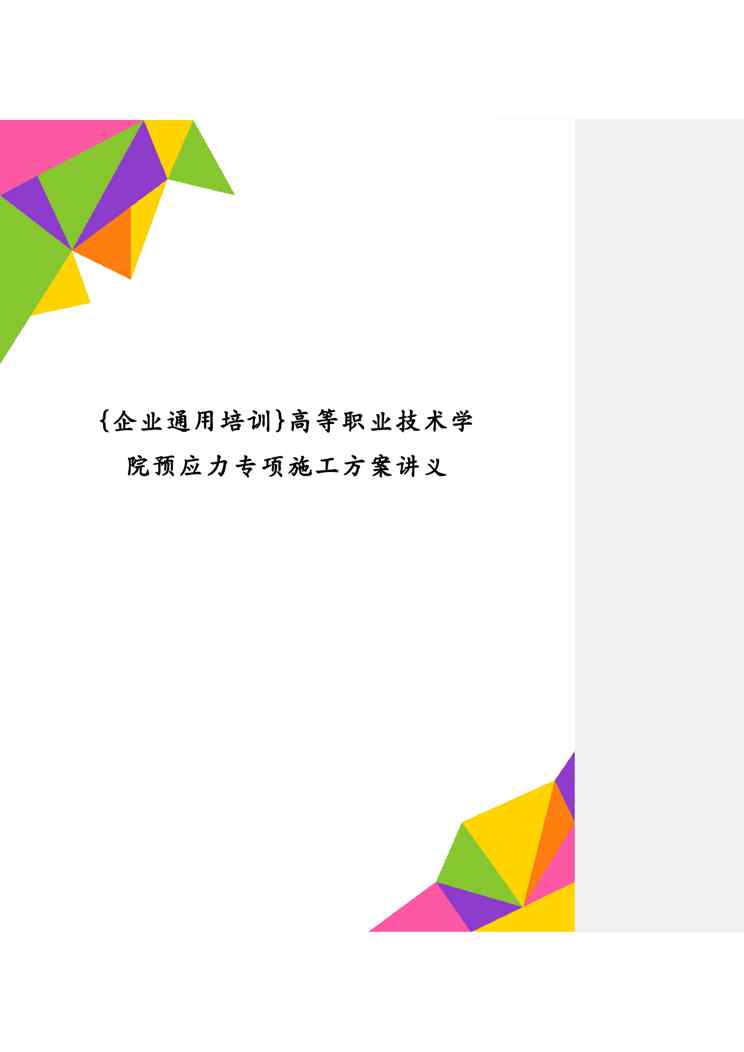 本站资深用户发布了最新的《{企业通用培训}高等职业技术学院预应力专项施工方案讲义1609152325》文档,以下内容为预览,详细内容可下载阅读。 声明:本站所有文章,如无特殊说明或标注,均为本站原创发布。任何个人或组织,在未征得本站同意时,禁止复制、盗用、采集、发布本站内容到任何网站、书籍等各类媒体平台。如若本站内容侵犯了原著者的合法权益,可联系我们进行处理。