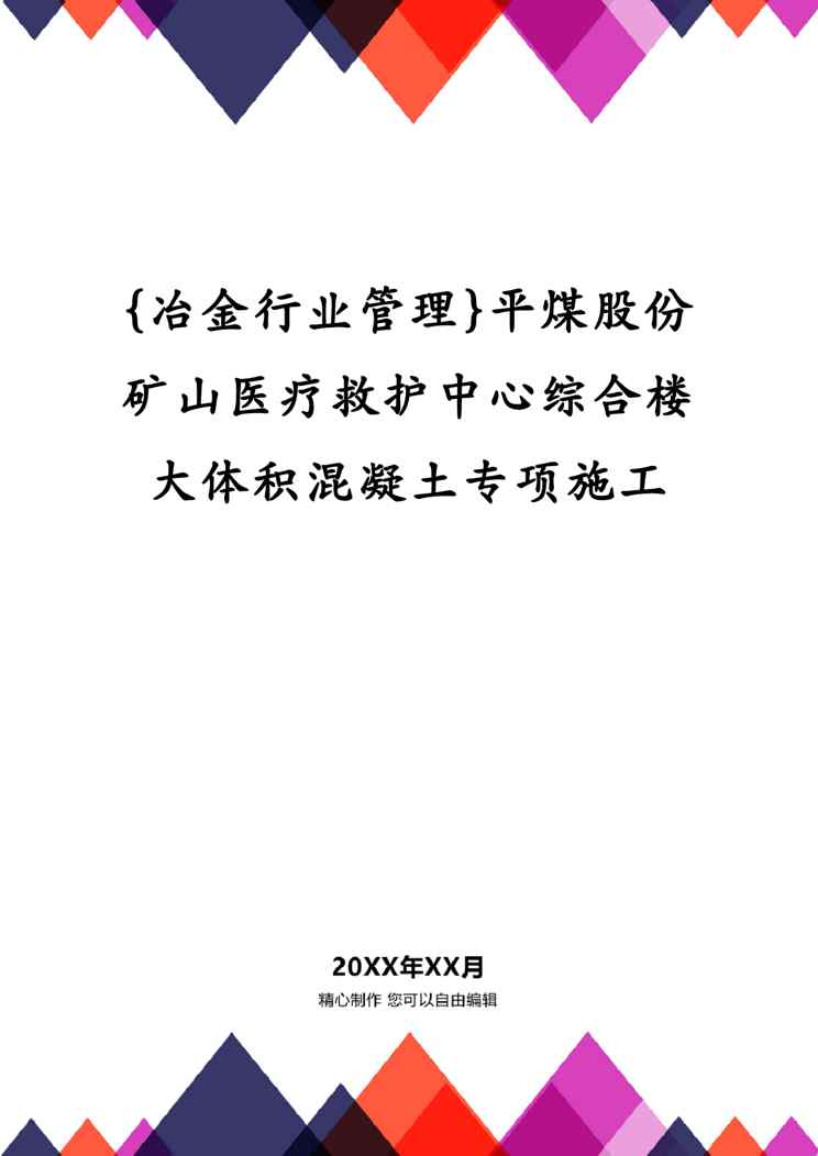 本站正式发布了《{冶金行业管理}平煤股份矿山医疗救护中心综合楼大体积混凝土专项施工》文档,文档详细内容可下载阅读。 声明:本站所有文章,如无特殊说明或标注,均为本站原创发布。任何个人或组织,在未征得本站同意时,禁止复制、盗用、采集、发布本站内容到任何网站、书籍等各类媒体平台。如若本站内容侵犯了原著者的合法权益,可联系我们进行处理。