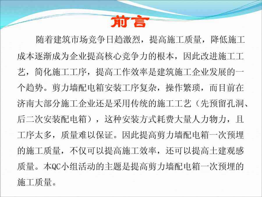 本站正式发布了《{品质管理QC七大手法}天元建设集团某市分公司提高剪力墙配电箱预留的施工质量QC》文档,文档详细内容可下载阅读。 声明:本站所有文章,如无特殊说明或标注,均为本站原创发布。任何个人或组织,在未征得本站同意时,禁止复制、盗用、采集、发布本站内容到任何网站、书籍等各类媒体平台。如若本站内容侵犯了原著者的合法权益,可联系我们进行处理。
